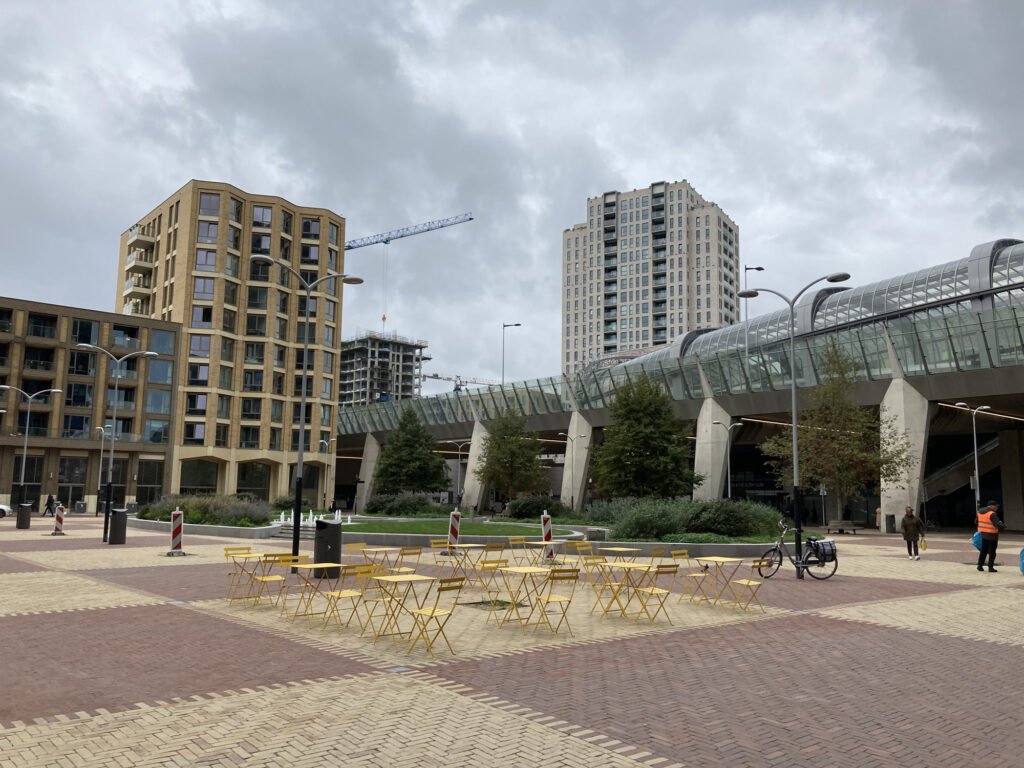 Het is een stedelijk en compact plan dat is ingeklemd tussen wegen en een metrolijn op dijken. De openbare ruimte van het Stationsgebied heeft 3 niveaus: op het stadsniveau 0 zijn er de straten, de pleinen en het park , op niveau 1 het busplein aan een drukke doorgaande weg en dwars daarop op niveau 2 een drukke autoweg met in de middenberm de metro. In het stationsgebied staat dit deel op hoge kolommen.